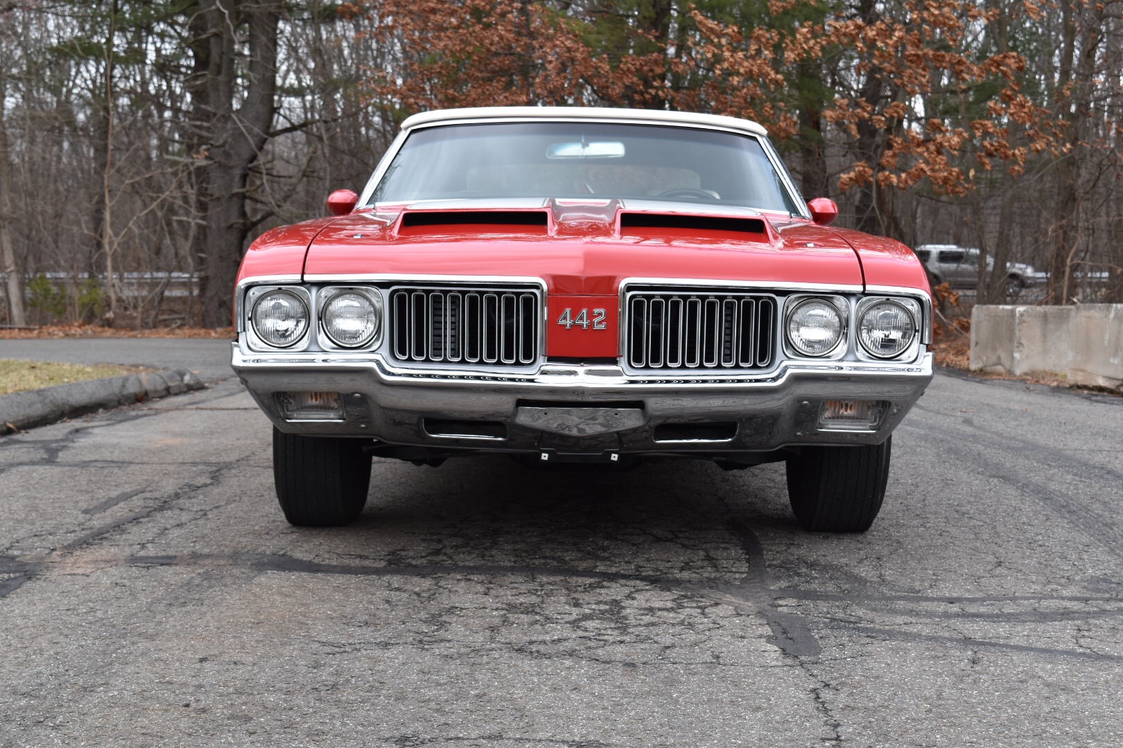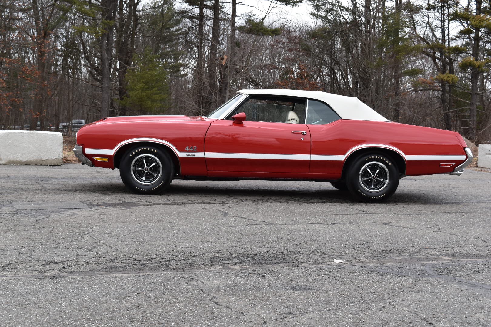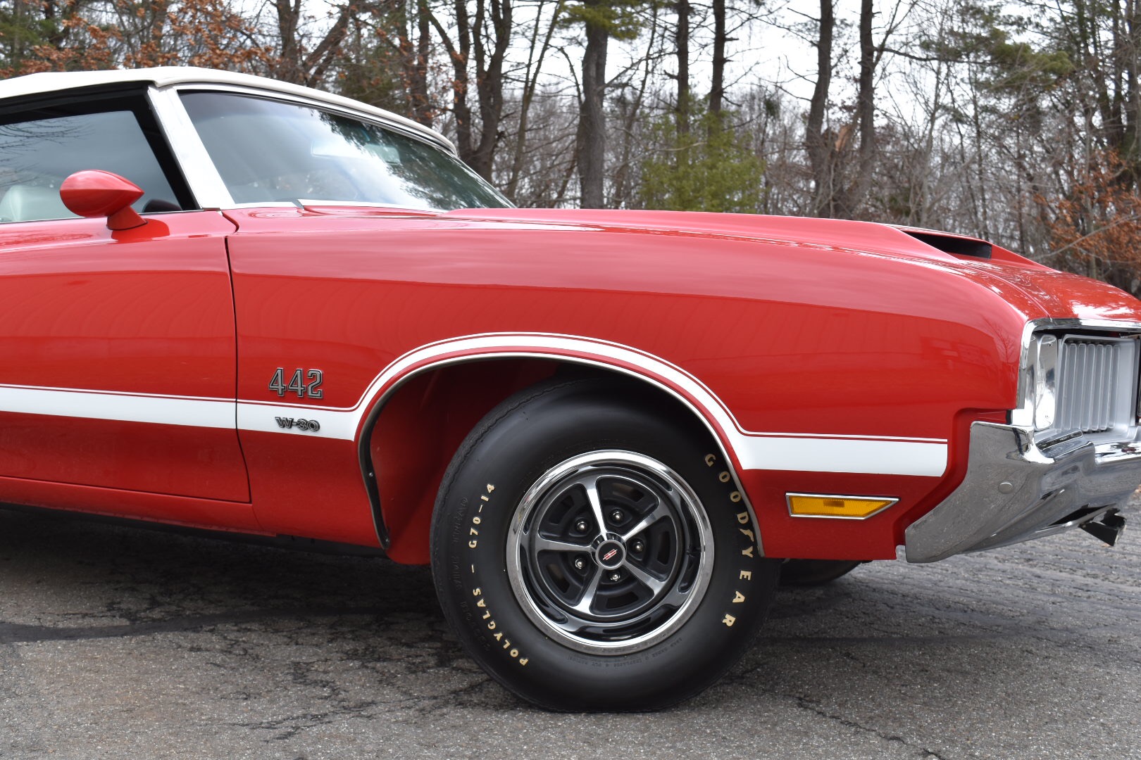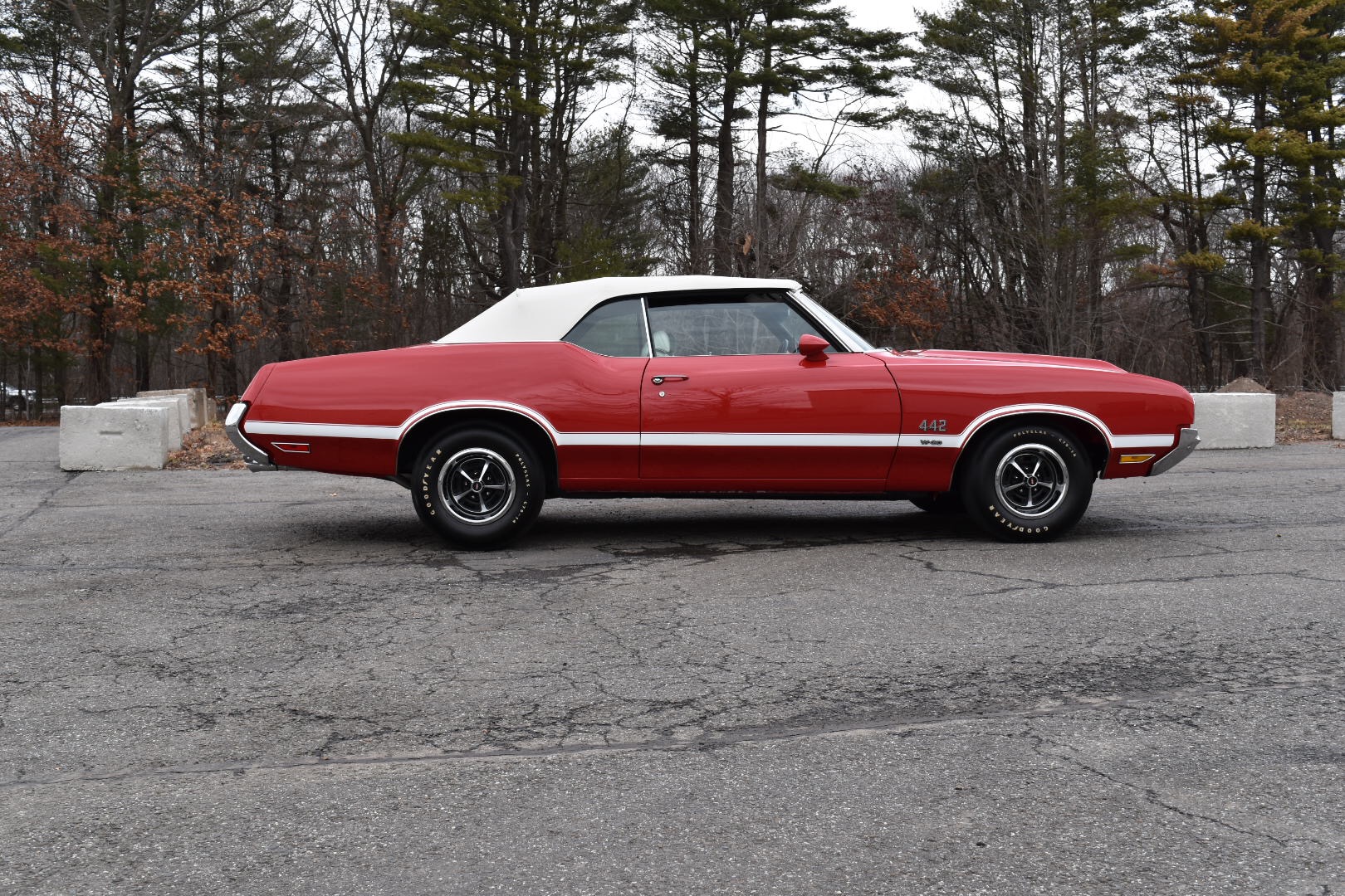 This is a matching-numbers 442 W30 4-speed convertible. This 442 is one of 96 ever built and is equipped with the 1970-only W27 aluminum rear axle. When the previous owner purchased the vehicle, it was a time capsule. It had not been driven since 1978 and it had original paint, original spark plug wires, carburetor, hoses and belts. It is an original 77,000 mile car (mileage not indicated on the ownership documents). The Ohio title to the second owner states 74,000 miles. It is documented with the original title number verifying ownership to the original owner, Window Sticker, pieces of the Build Sheets recovered before restoration took place, some pictures of the car from 1970 and pictures of the car when the previous owner purchased it. The car underwent a frame-off, no-expense-spared, year-long restoration by a 20-year exclusive Oldsmobile restoration shop. This is an outstanding representation of a 442 Olds. It is one of the rarest Oldsmobiles equipped with extremely rare high-performance options.
