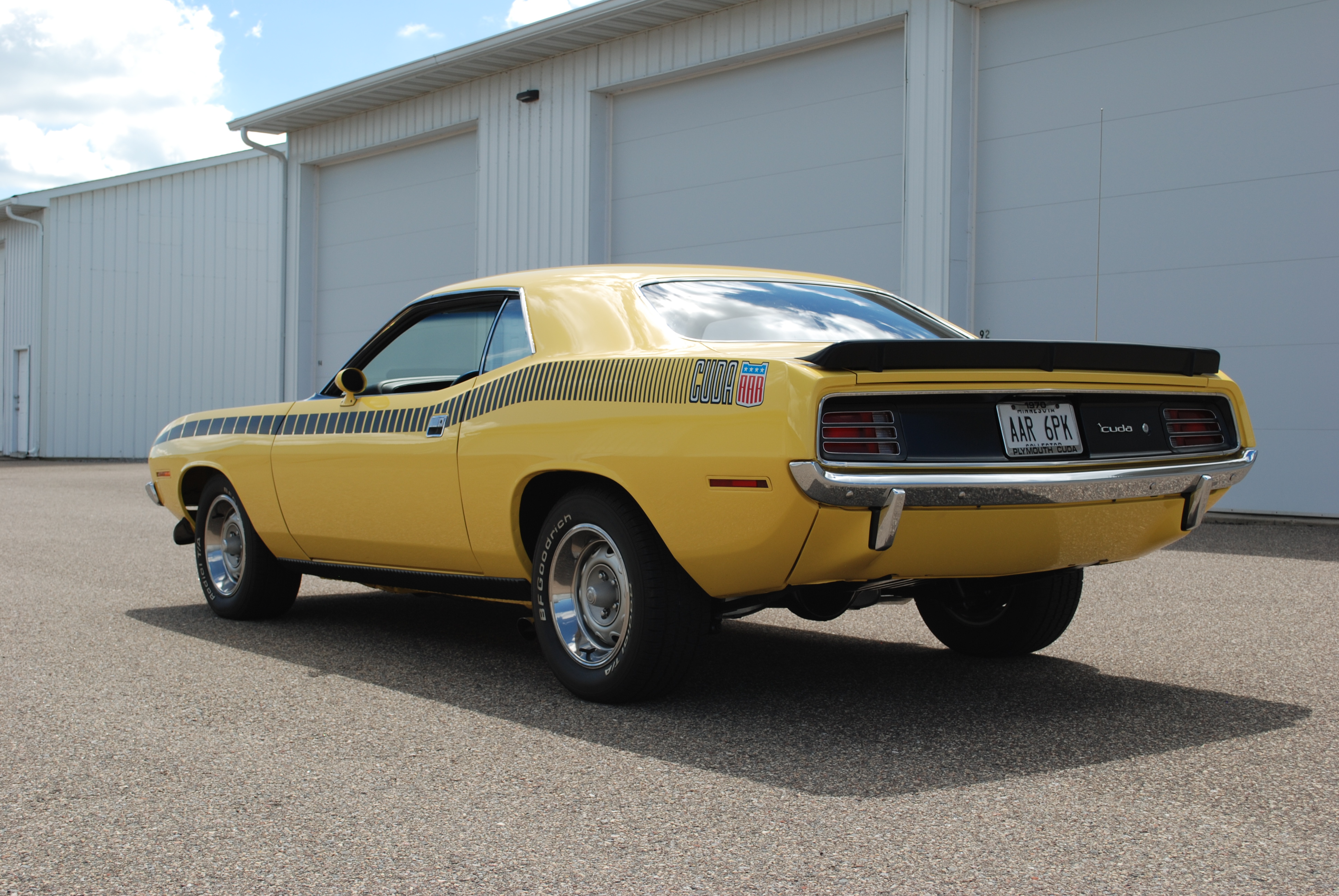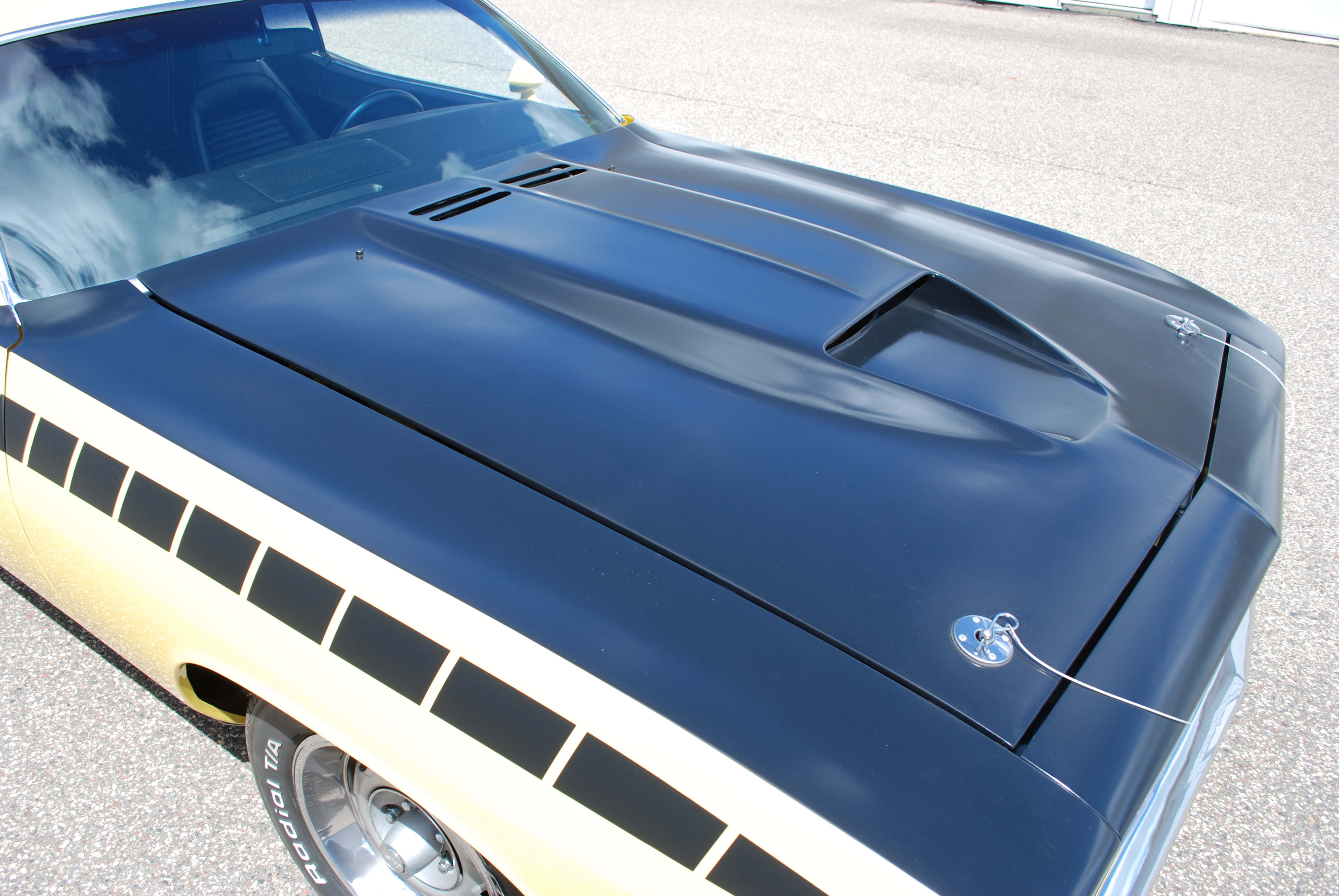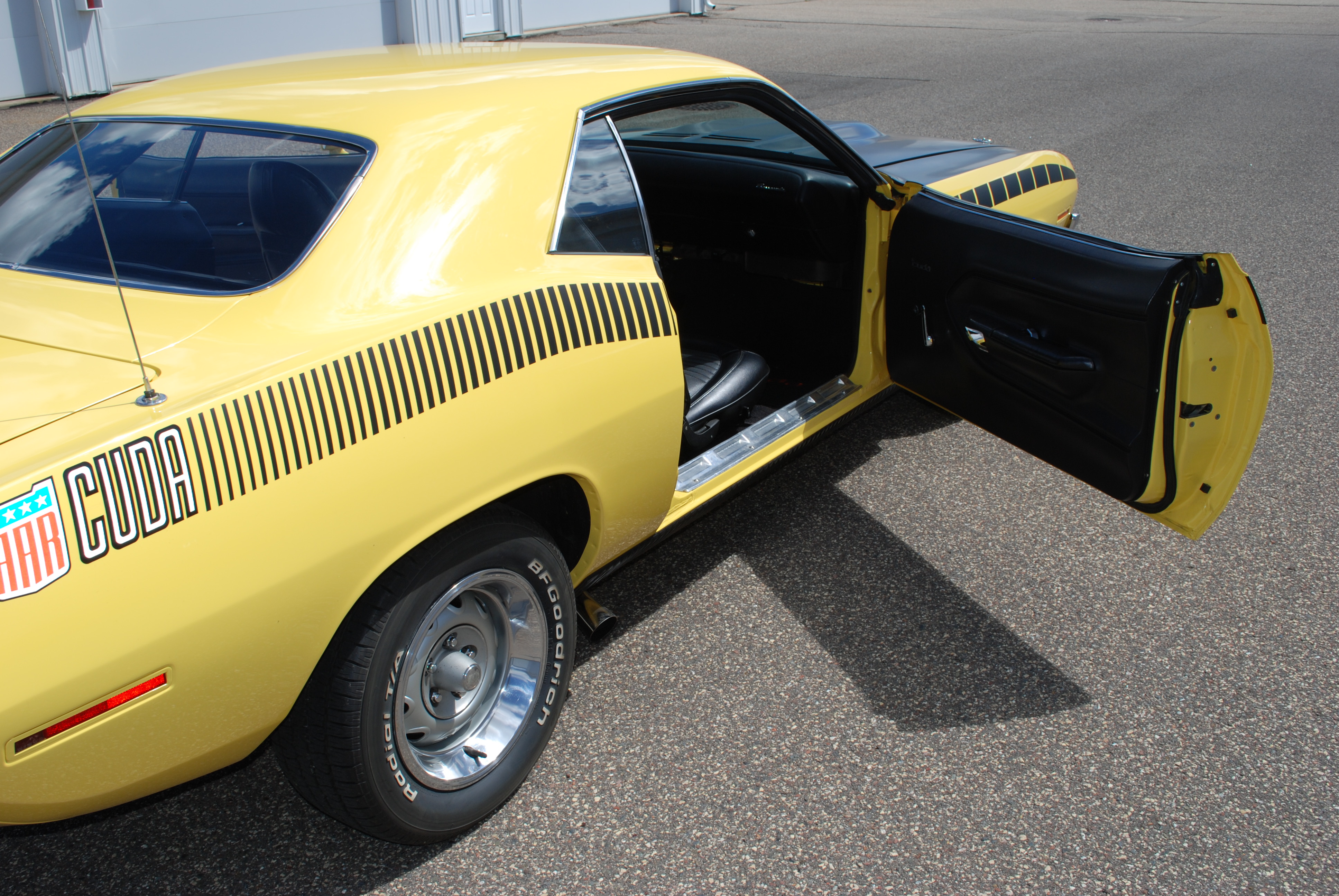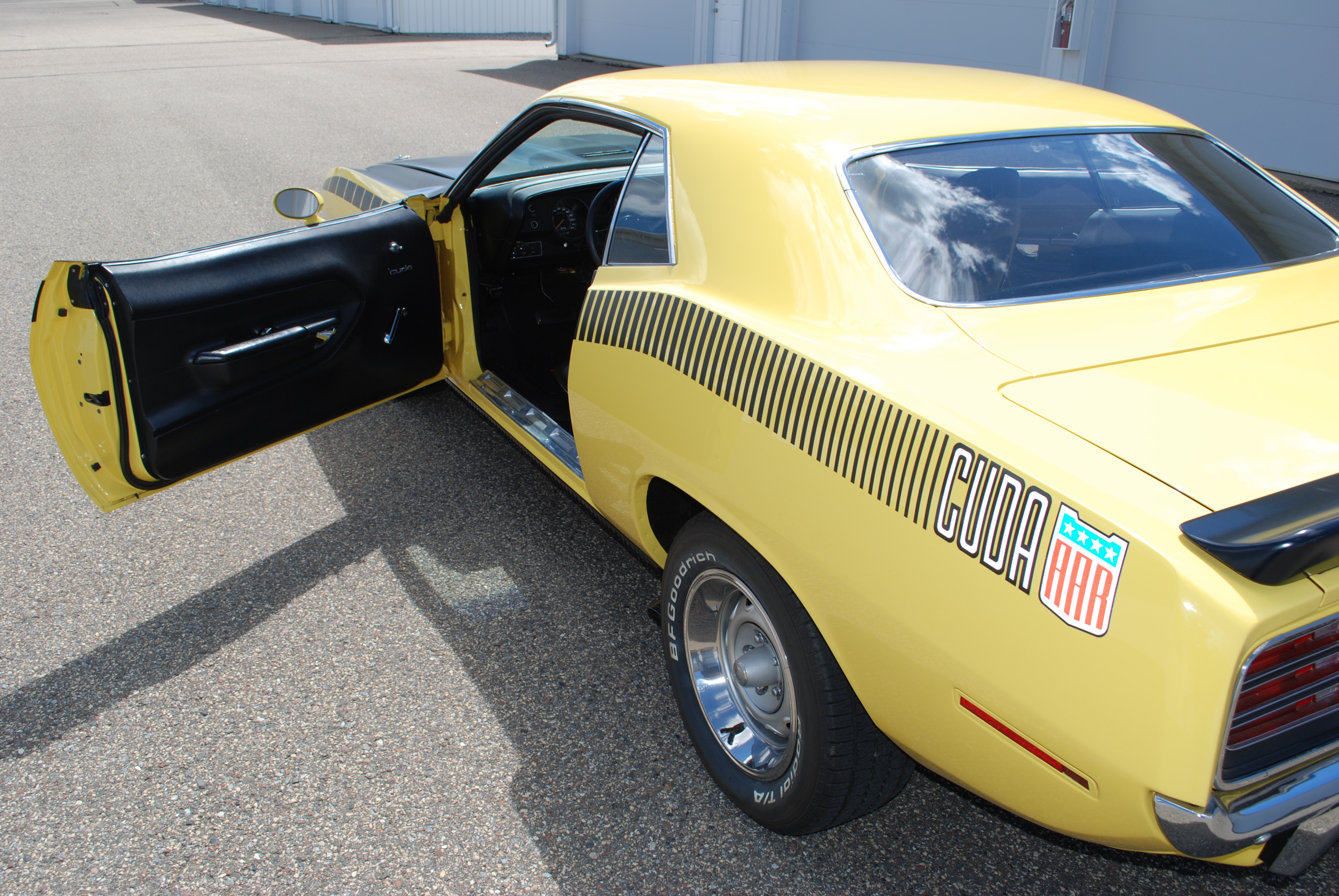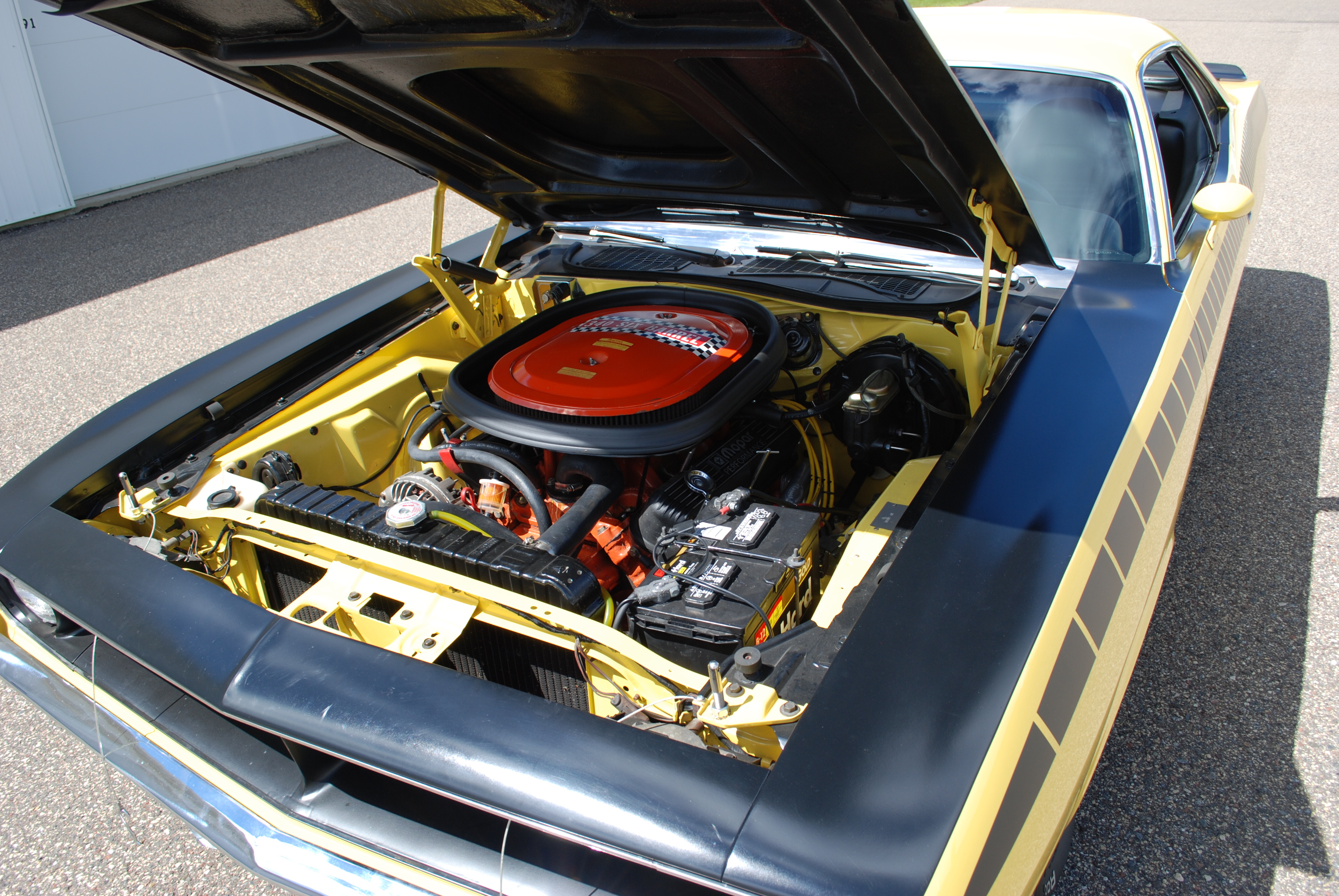 Lemon Twist Yellow AAR ‘Cuda documented by Fender Tags with the original body VIN numbers located in the correct places. The AAR ‘Cuda was only produced for approximately 1-1/2 months (March 10-April 17) during the year of 1970 with only 1,614 produced with the automatic 3-speed transmission. The AAR ‘Cuda offered lots of power with a V8, 340 6-barrel engine. The hood is made of lightweight fiberglass. What really sets this hood apart from all other cars is the hood scoop, the sleek design really blends in nicely with the rest of the car. The spoilers on the AAR also set it apart from other cars. The front spoilers are what they call “eyebrow” spoilers and the rear spoiler is what is called a “duck tail.” The AAR was produced to race in the SCAA road racing and to compete with the Ford Mustang. AAR actually means All American Racers. The AAR ‘Cuda was different from the regular ‘Cuda in many ways. This rare ‘Cuda with a 340 Six Pack engine is rebuilt to factory specifications and really commands attention when all six barrels are engaged. Loaded with following options: 727 Torque Flite transmission, Rally dash, power brakes, power steering, bucket seats with center console, left-hand mirror, hood pins, side exhaust, front & rear spoilers, Trans Am package, tachometer and Fresh Air fiberglass hood.