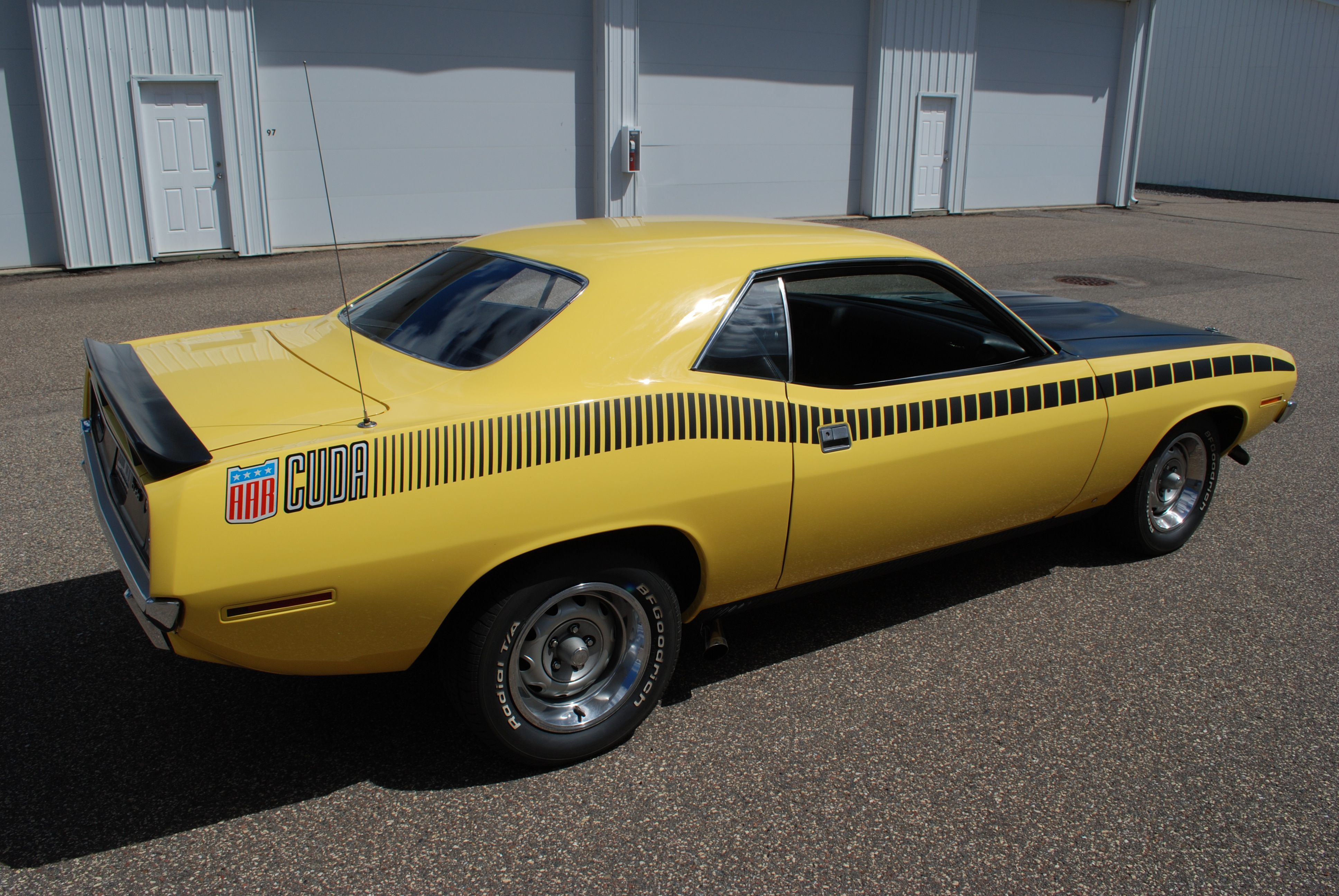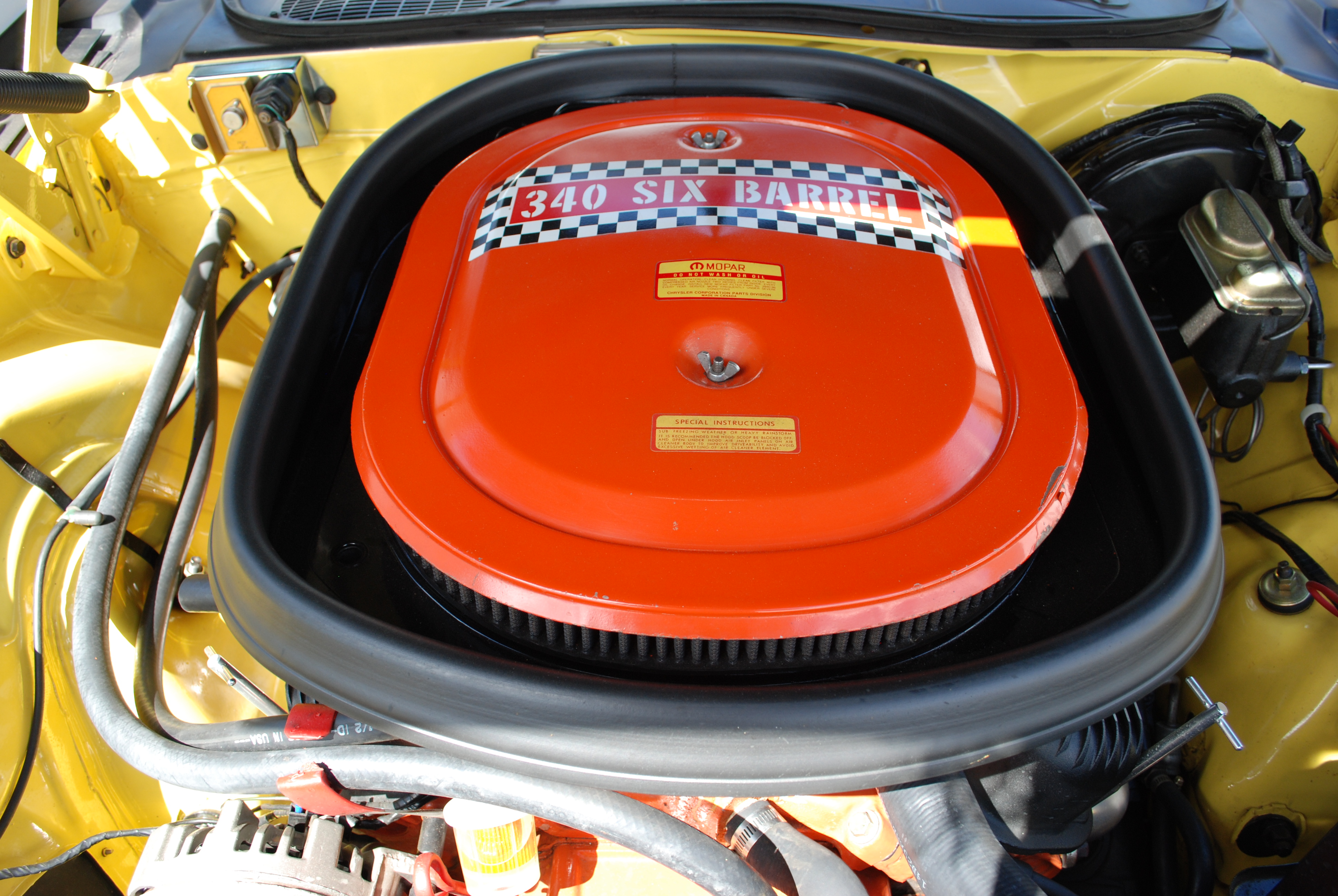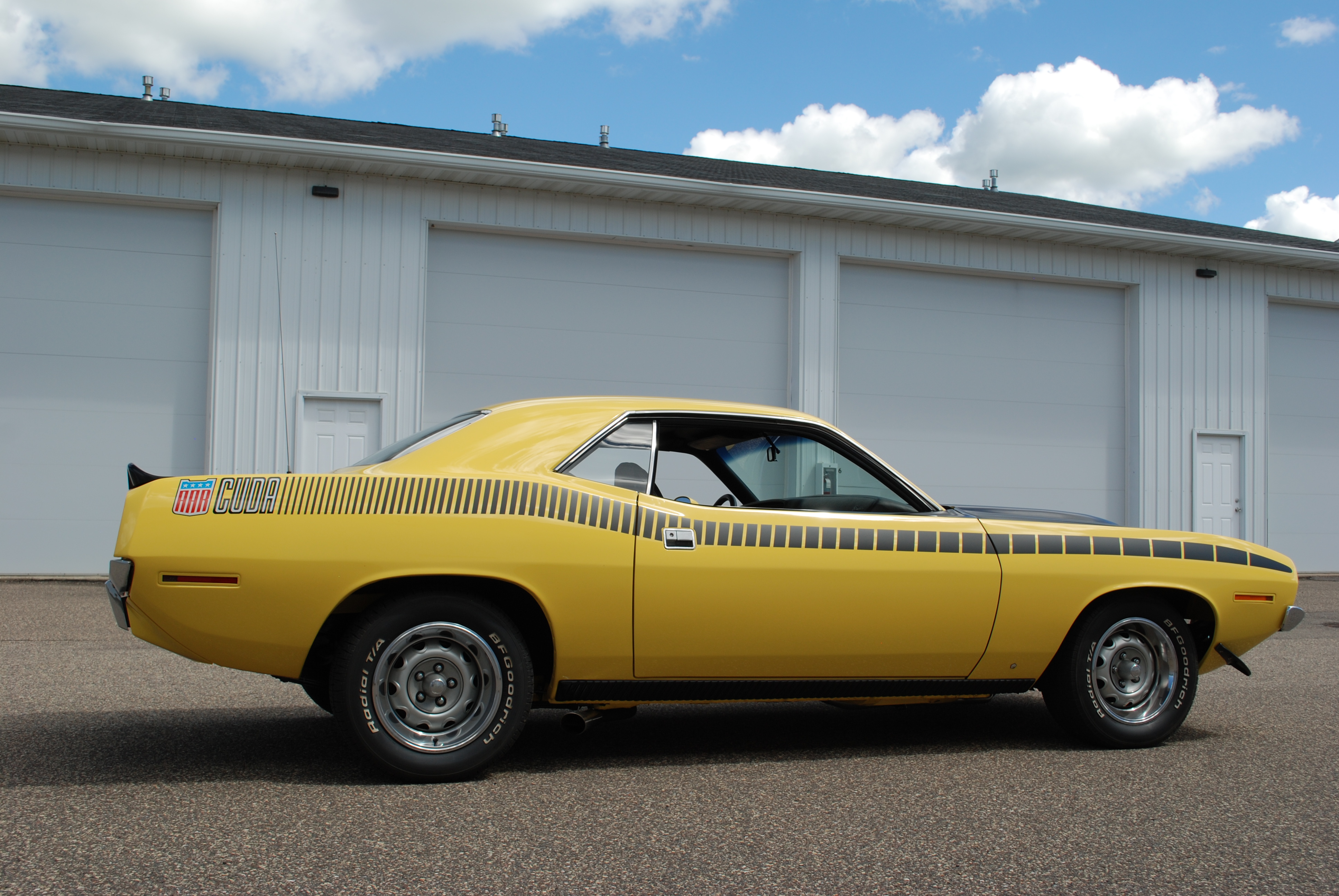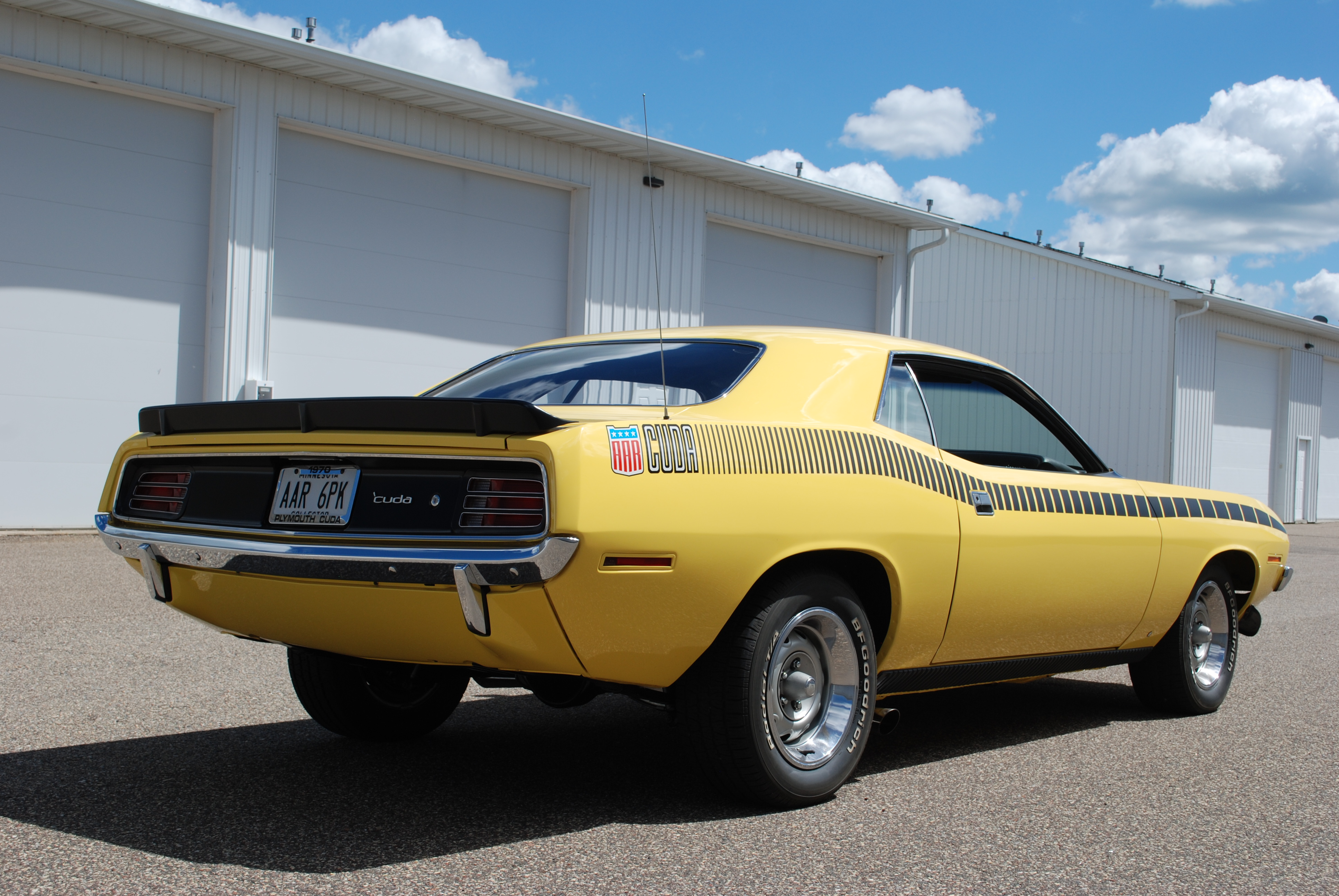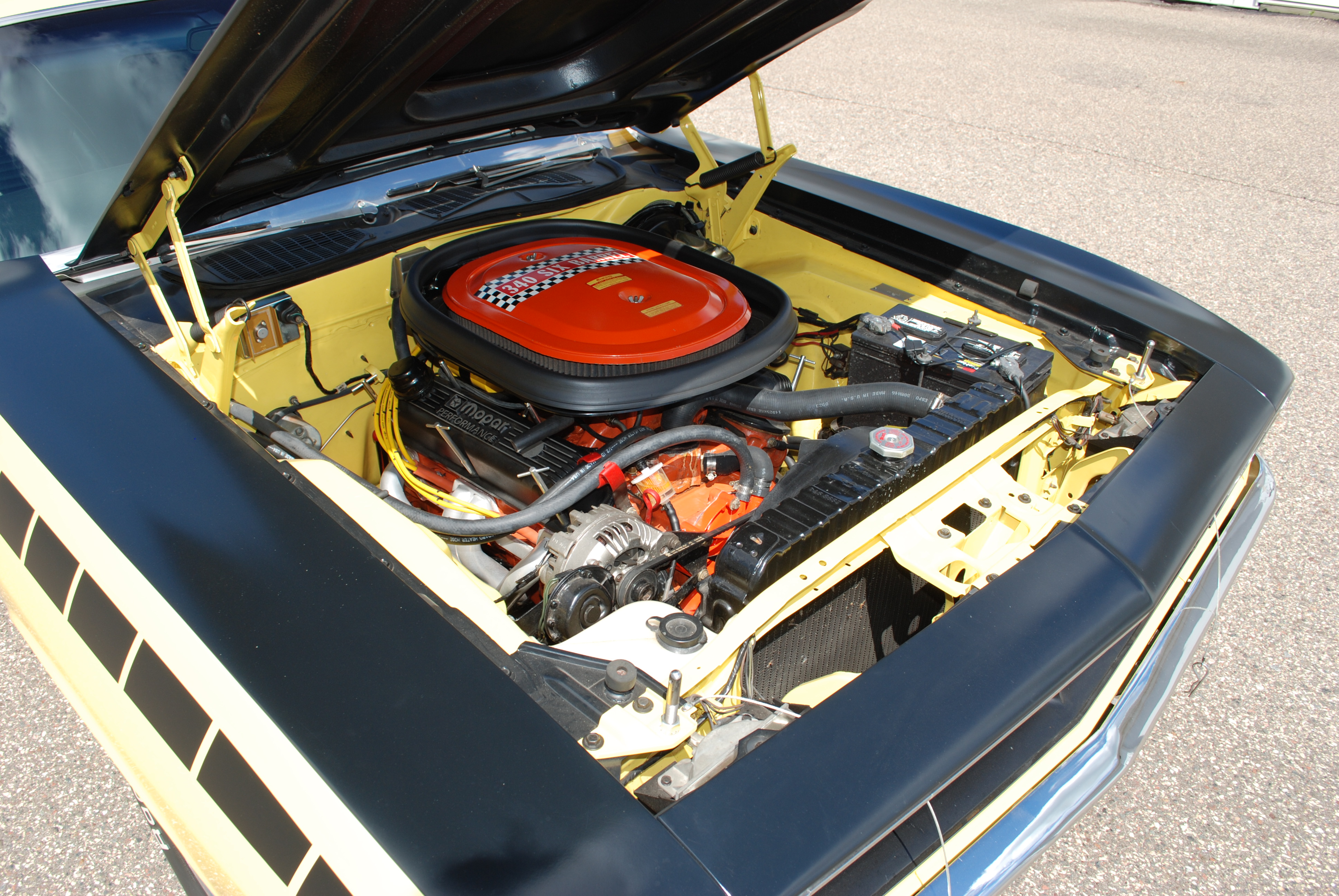 Lemon Twist Yellow AAR ‘Cuda documented by Fender Tags with the original body VIN numbers located in the correct places. The AAR ‘Cuda was only produced for approximately 1-1/2 months (March 10-April 17) during the year of 1970 with only 1,614 produced with the automatic 3-speed transmission. The AAR ‘Cuda offered lots of power with a V8, 340 6-barrel engine. The hood is made of lightweight fiberglass. What really sets this hood apart from all other cars is the hood scoop, the sleek design really blends in nicely with the rest of the car. The spoilers on the AAR also set it apart from other cars. The front spoilers are what they call “eyebrow” spoilers and the rear spoiler is what is called a “duck tail.” The AAR was produced to race in the SCAA road racing and to compete with the Ford Mustang. AAR actually means All American Racers. The AAR ‘Cuda was different from the regular ‘Cuda in many ways. This rare ‘Cuda with a 340 Six Pack engine is rebuilt to factory specifications and really commands attention when all six barrels are engaged. Loaded with following options: 727 Torque Flite transmission, Rally dash, power brakes, power steering, bucket seats with center console, left-hand mirror, hood pins, side exhaust, front & rear spoilers, Trans Am package, tachometer and Fresh Air fiberglass hood.