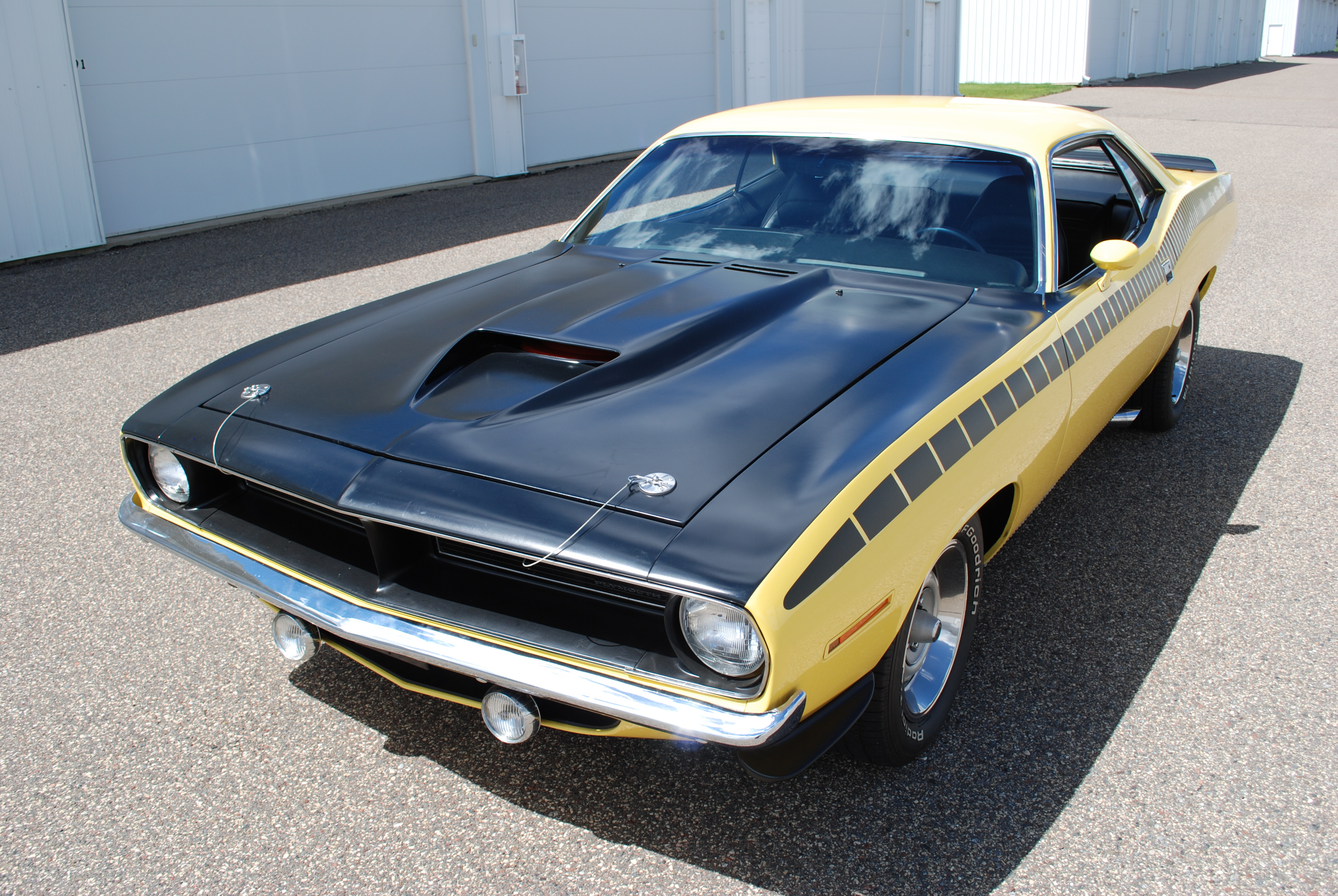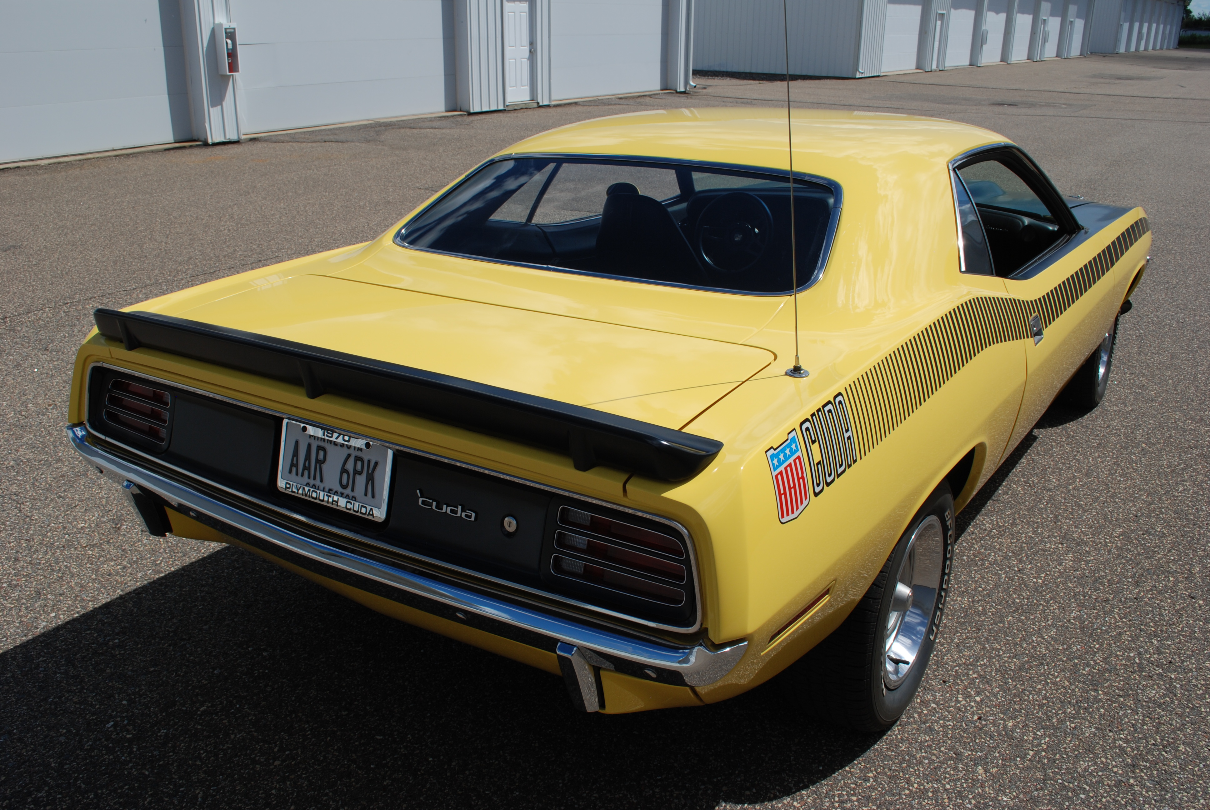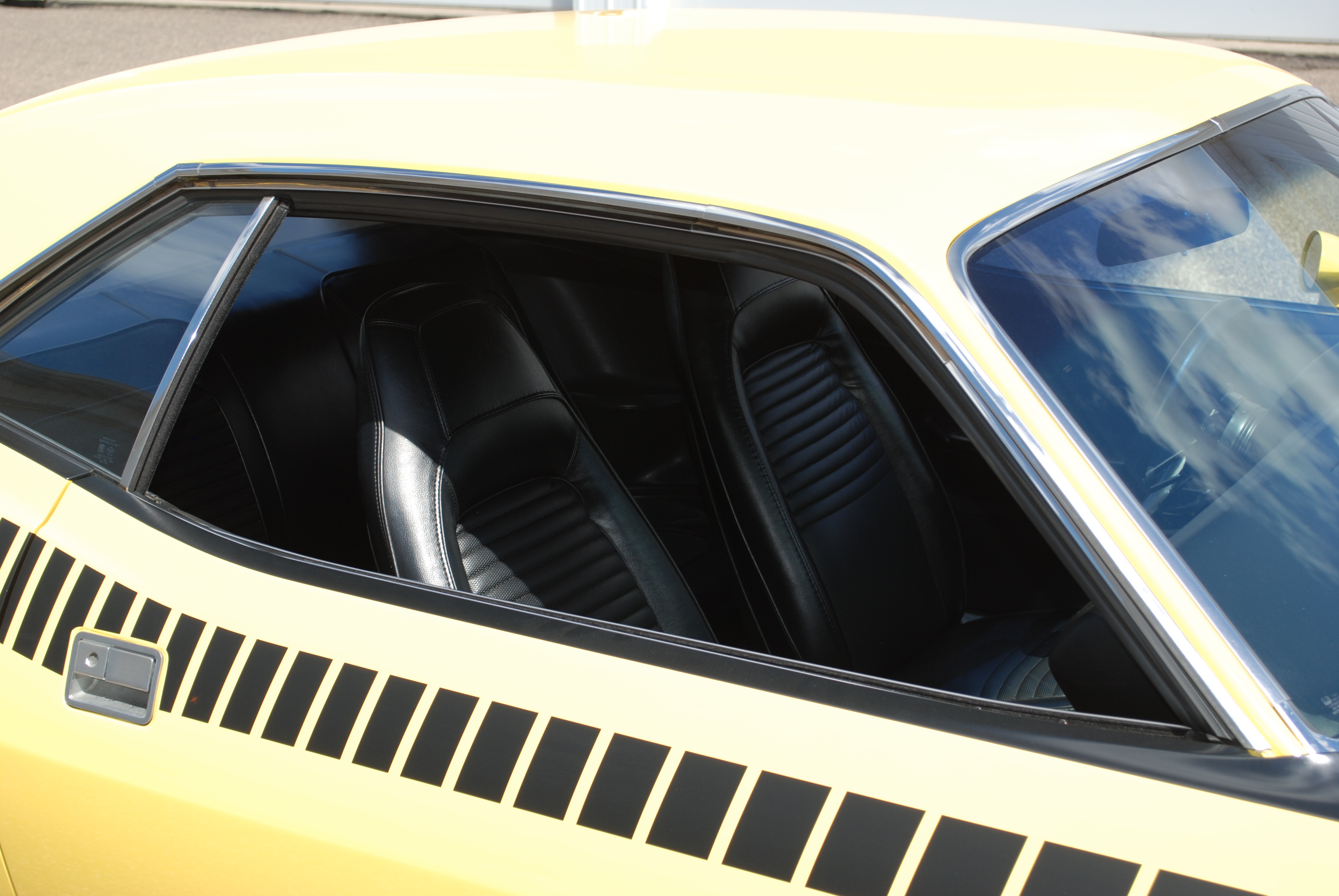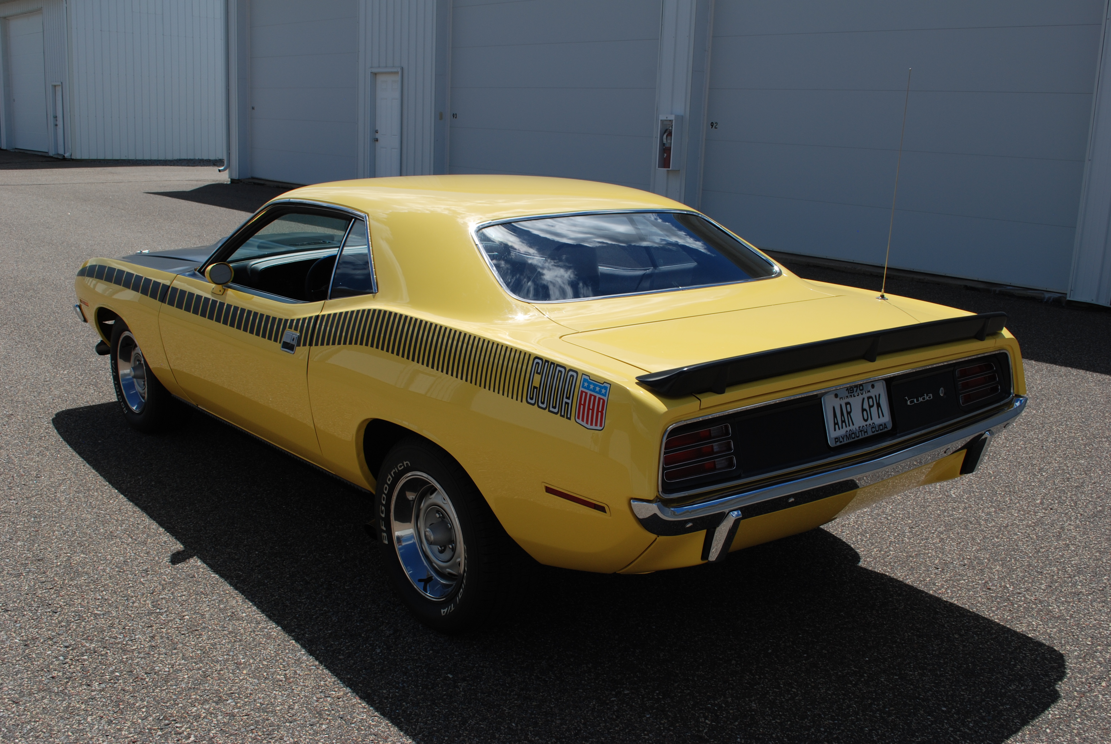 Lemon Twist Yellow AAR ‘Cuda documented by Fender Tags with the original body VIN numbers located in the correct places. The AAR ‘Cuda was only produced for approximately 1-1/2 months (March 10-April 17) during the year of 1970 with only 1,614 produced with the automatic 3-speed transmission. The AAR ‘Cuda offered lots of power with a V8, 340 6-barrel engine. The hood is made of lightweight fiberglass. What really sets this hood apart from all other cars is the hood scoop, the sleek design really blends in nicely with the rest of the car. The spoilers on the AAR also set it apart from other cars. The front spoilers are what they call “eyebrow” spoilers and the rear spoiler is what is called a “duck tail.” The AAR was produced to race in the SCAA road racing and to compete with the Ford Mustang. AAR actually means All American Racers. The AAR ‘Cuda was different from the regular ‘Cuda in many ways. This rare ‘Cuda with a 340 Six Pack engine is rebuilt to factory specifications and really commands attention when all six barrels are engaged. Loaded with following options: 727 Torque Flite transmission, Rally dash, power brakes, power steering, bucket seats with center console, left-hand mirror, hood pins, side exhaust, front & rear spoilers, Trans Am package, tachometer and Fresh Air fiberglass hood.