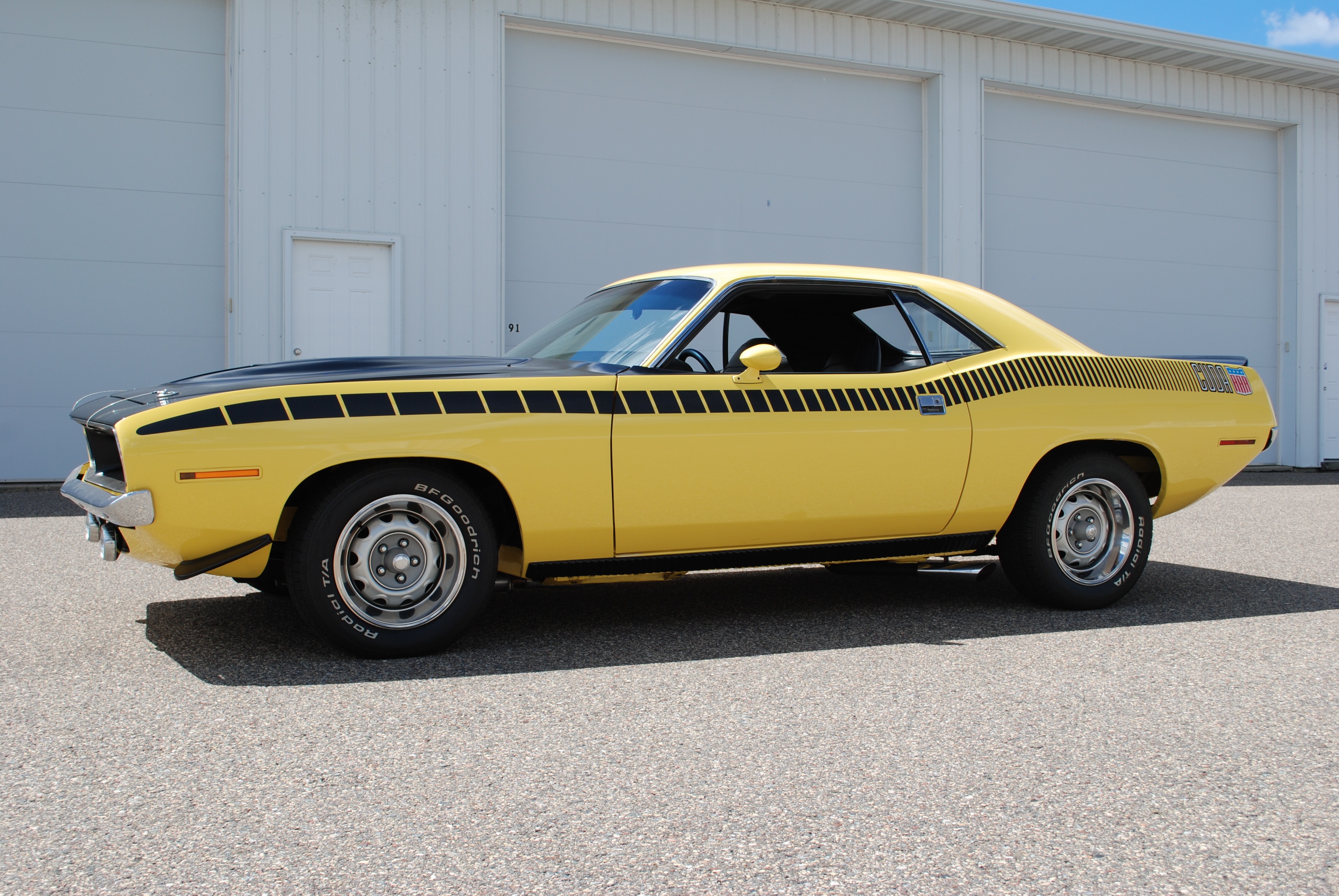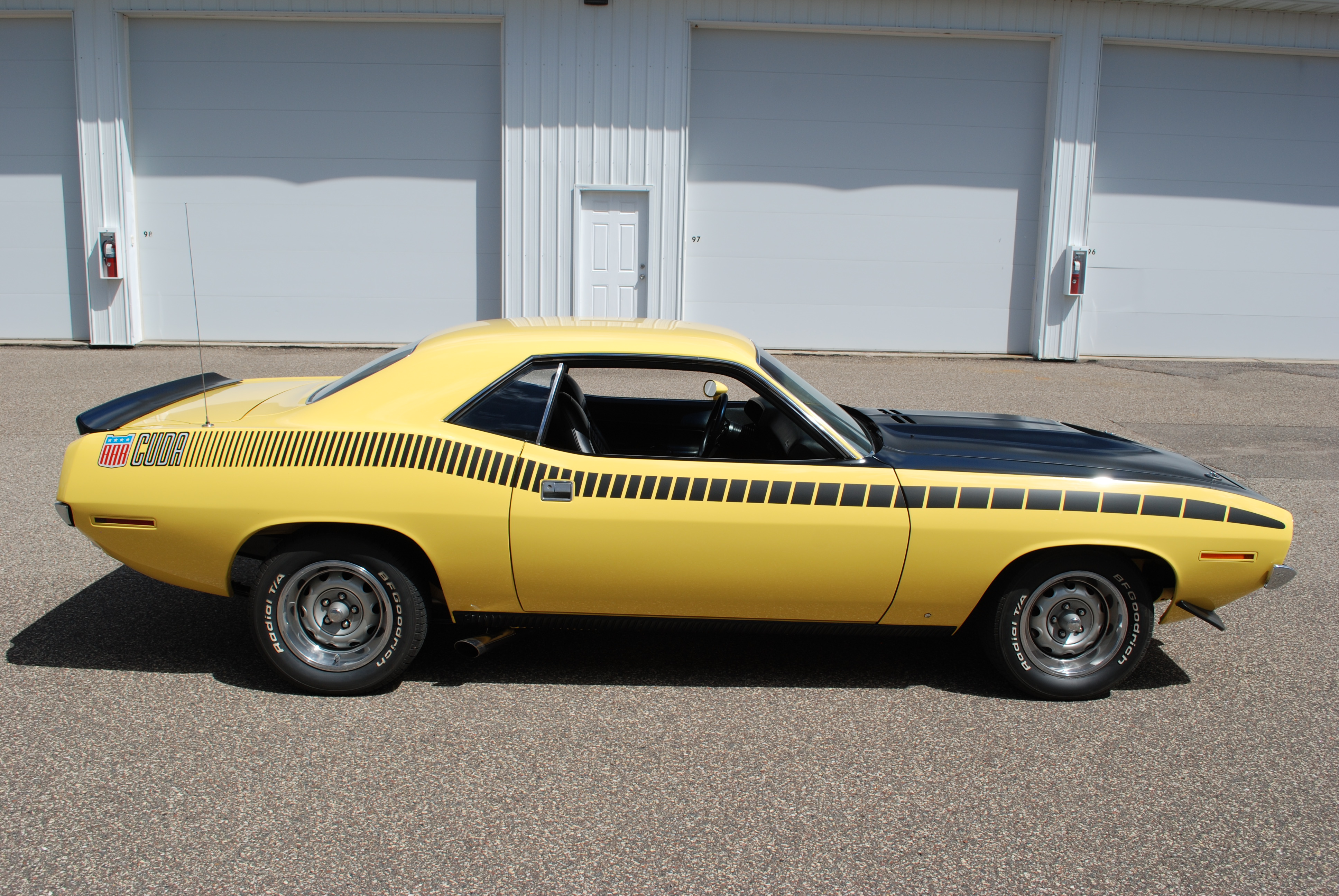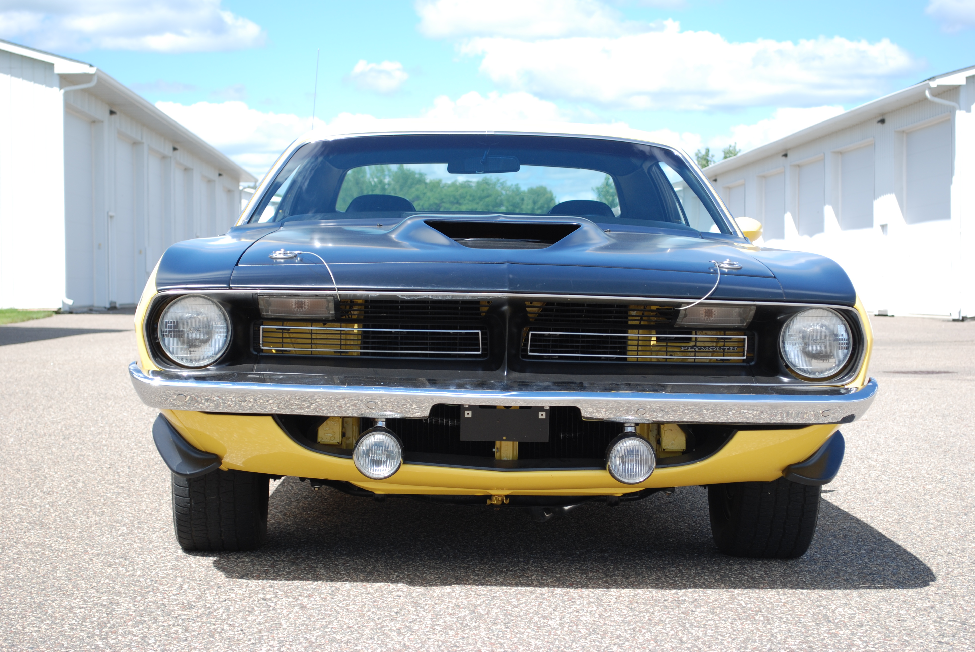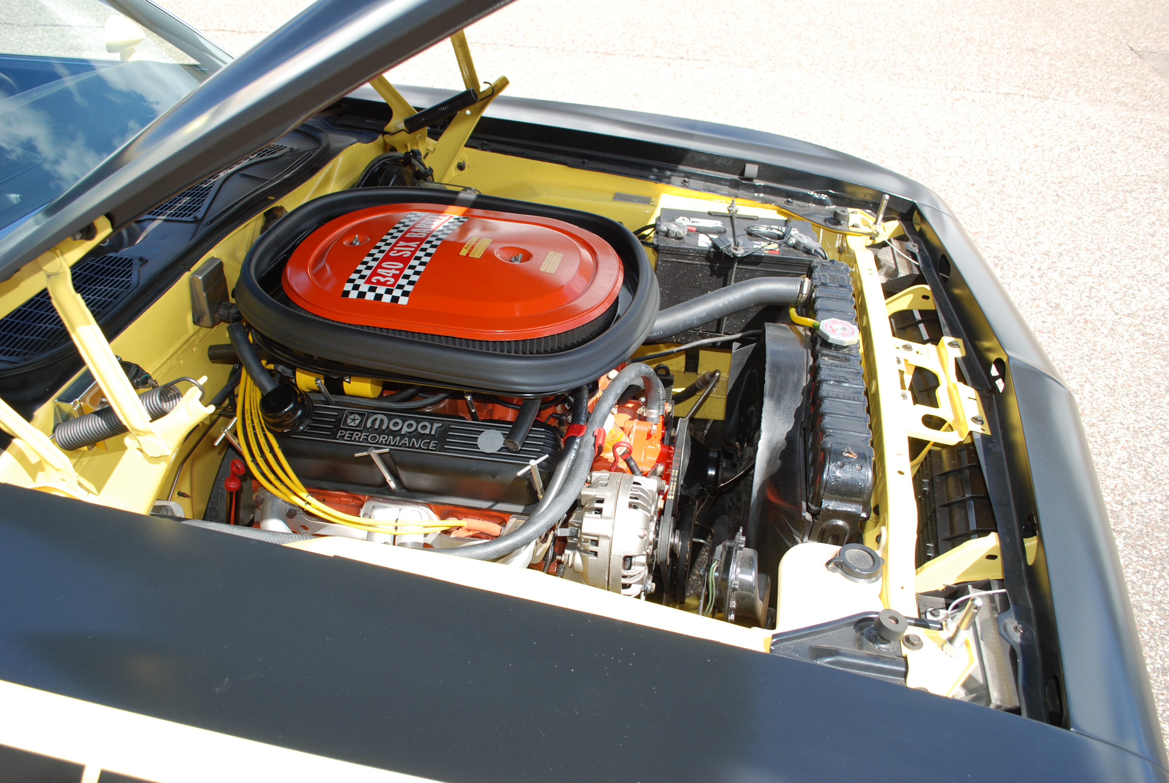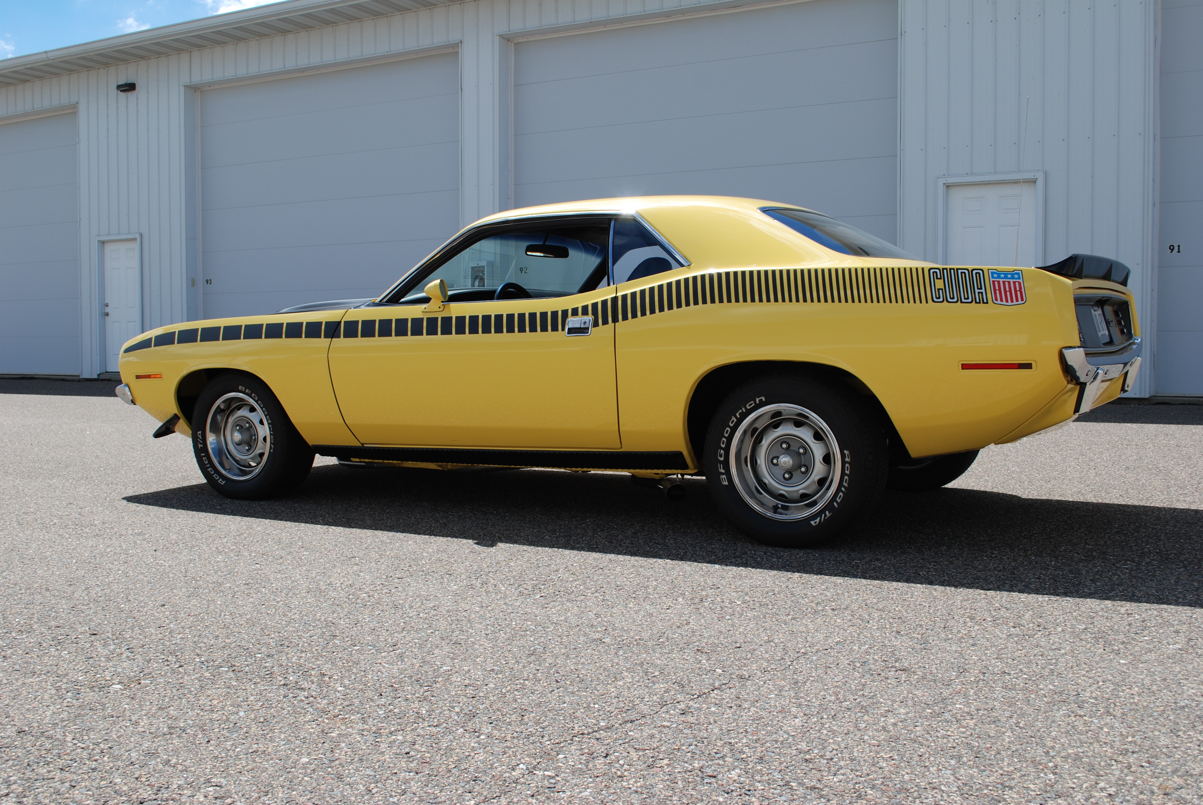 Lemon Twist Yellow AAR ‘Cuda documented by Fender Tags with the original body VIN numbers located in the correct places. The AAR ‘Cuda was only produced for approximately 1-1/2 months (March 10-April 17) during the year of 1970 with only 1,614 produced with the automatic 3-speed transmission. The AAR ‘Cuda offered lots of power with a V8, 340 6-barrel engine. The hood is made of lightweight fiberglass. What really sets this hood apart from all other cars is the hood scoop, the sleek design really blends in nicely with the rest of the car. The spoilers on the AAR also set it apart from other cars. The front spoilers are what they call “eyebrow” spoilers and the rear spoiler is what is called a “duck tail.” The AAR was produced to race in the SCAA road racing and to compete with the Ford Mustang. AAR actually means All American Racers. The AAR ‘Cuda was different from the regular ‘Cuda in many ways. This rare ‘Cuda with a 340 Six Pack engine is rebuilt to factory specifications and really commands attention when all six barrels are engaged. Loaded with following options: 727 Torque Flite transmission, Rally dash, power brakes, power steering, bucket seats with center console, left-hand mirror, hood pins, side exhaust, front & rear spoilers, Trans Am package, tachometer and Fresh Air fiberglass hood.